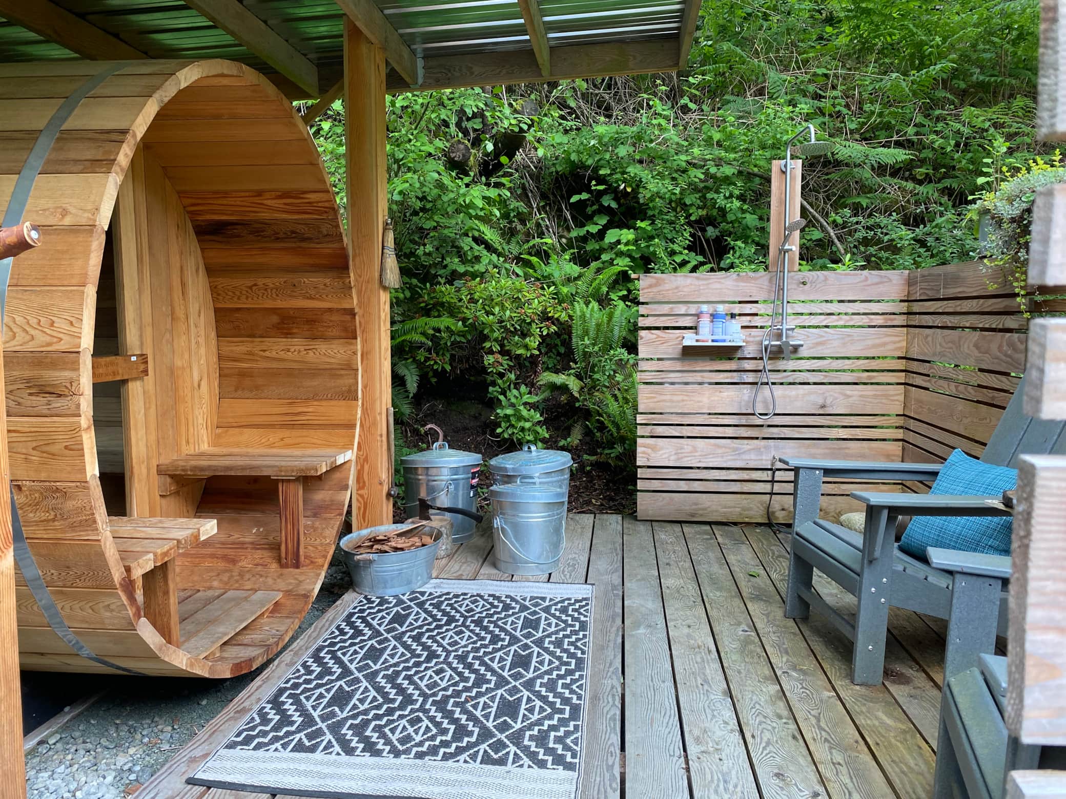 For the brave, there’s the cold plunge. For the rest of us, the hot outdoor shower feels just as heavenly. You’ll find warm robes, fluffy towels, and “In Use” / “Open” signs to keep things private. And if you’ve never lit a sauna fire before, we’re happy to show you how — it’s one of those little Whidbey Island skills worth learning.