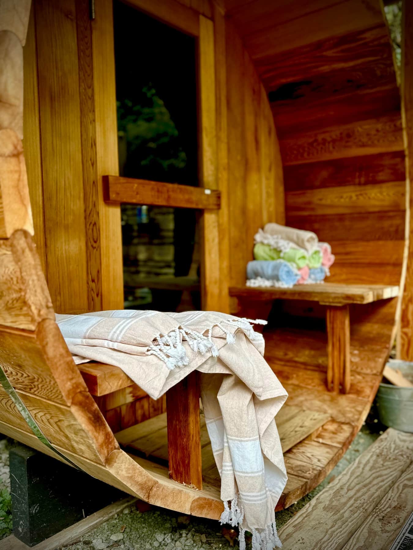 Shared by both the Cabin and Cottage, this little corner of the property feels extra special. The wood-fired cedar sauna fills the air with the warm, rich scent of wood and smoke — it’s cozy, earthy, and completely relaxing. On cold, rainy, or snowy nights, it turns into pure magic. Stepping out into the cool air, or even a swirl of snowflakes, is the best part.